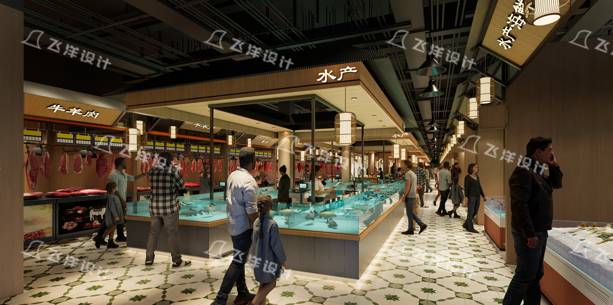 在此基础上,通过 光照强度与角度的精细调节 来突出品质。例如,为精品果蔬设置重点照明,增强其新鲜水灵的视觉冲击力;在海鲜池上方增加防眩光点光源,让水波与鳞光交相辉映。好的光照设计,能让整个市场看起来明亮、整洁、高级,直接提升顾客的价值感知与购买欲。