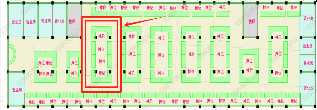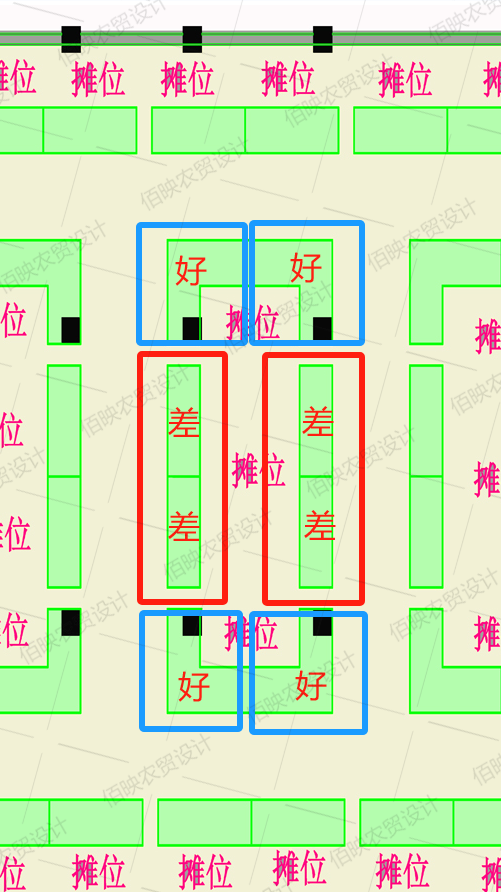 (如上图所示,这种不合理的长条摊岛布局中,进入摊位中央需要途径多个其它摊位的营业区)