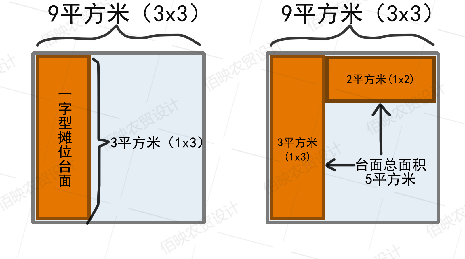 (如上图所示,同样的经营空间,L型摊位的台面比一型摊位足足大出2/3)