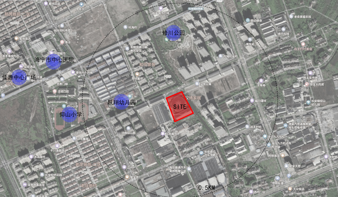 项目位于海宁市长安镇汉帛路南侧、三里塘港西侧。周边有跃翔幼儿园、修川公园、仰山小学、海宁市中心医院等配套设施。总用地面积约18000平方米,主体建筑为圆形3层商业楼。其中农贸市场位于主体建筑一层,农贸市场经营面积约6000平方米,2-3层为餐饮、社区配套、商业等业态。