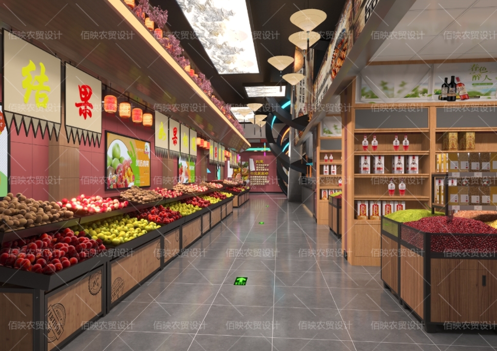 现在的农贸市场流行简约而不简单,故而顶部并未进行大范围吊顶,转而用轻装点缀修饰,旌旗、挂画、干枝、水墨灯箱等设计要素相结合,打造出温馨古朴且不乏年轻时尚的整体风格。