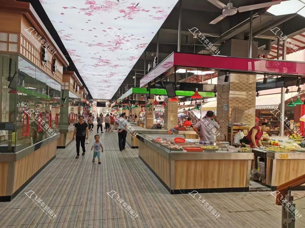 顶面叙事:在整个市场通道上方,铺设以桃花图案为主题的天花软膜。统一的视觉语言将“一字型”空间转化为连贯的“桃源画卷”,有效拉伸视觉,消除狭长空间的压抑感,营造春意盎然、生机勃勃的购物氛围。