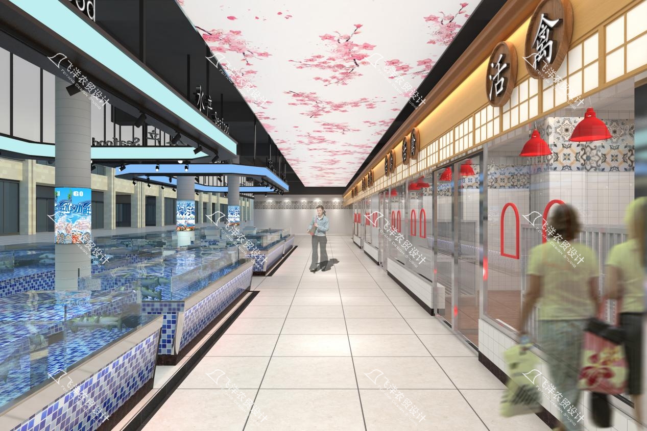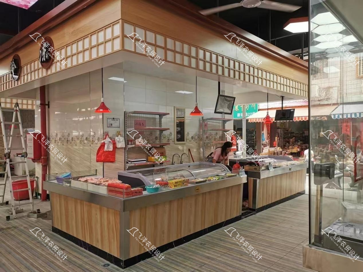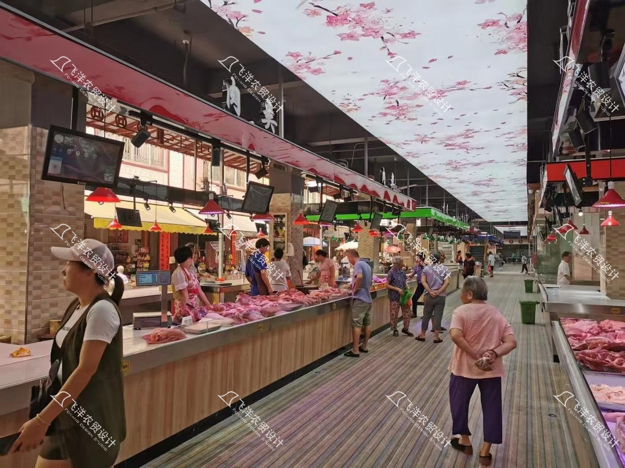 分区美学:各业态区在统一主题下进行差异化演绎。肉类区采用红色简约吊楣与木纹柜台,温暖质朴;营业房以中式复古窗花与圆形竹盘为店招,点缀田园雅趣;水产区则运用蓝色调吊楣与马赛克瓷砖,呼应海洋意象,给人以清凉、洁净的心理感受。