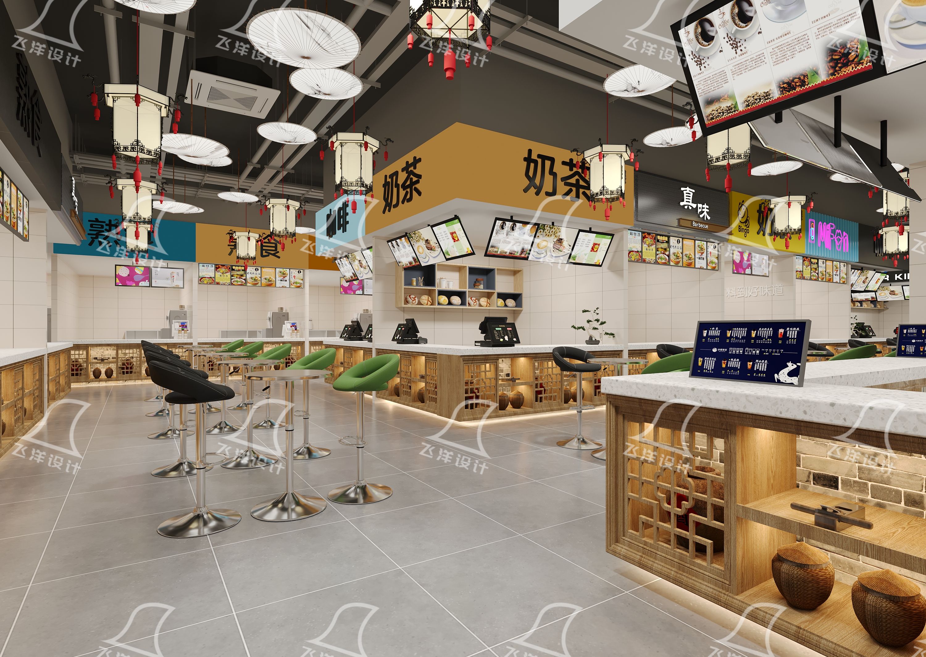 核心元素场景化:全场贯穿中式宫灯造型吊灯与红色流苏,部分区域点缀纸伞造型顶灯,形成独特的视觉韵律。摊位立面大量运用原木色格栅与中式线条,服务台背景墙融入水墨山水纹理,共同构筑雅致的空间基底。
