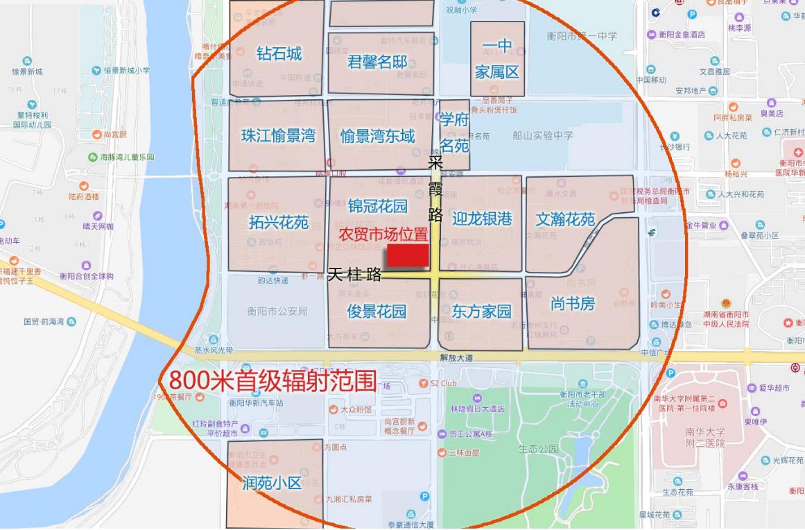 (上图为湖南某地一个典型的围绕住宅小区的农贸市场,周边800米辐射范围内有10余个住宅区,其中包含2个学区。定位为典型的社区配套型便民农贸市场。)