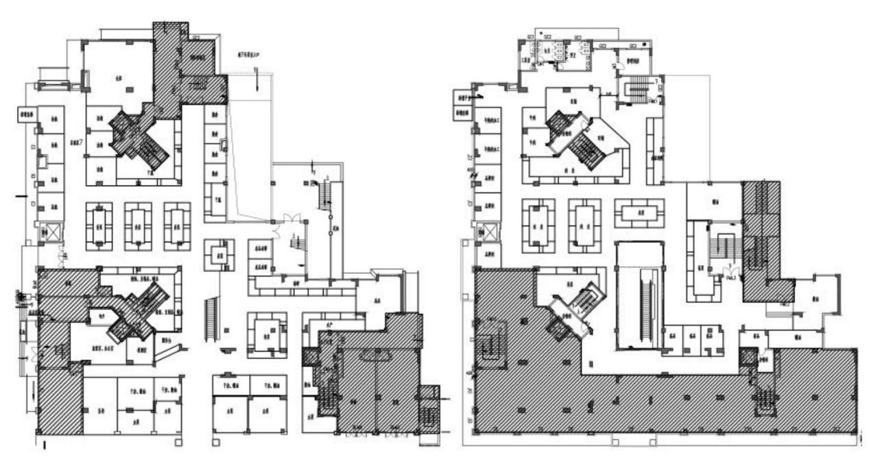 (上图为广西某市场的布局,所在建筑为6层住宅,农贸市场经营范围为1-2层的局部,经营范围内被楼梯间、剪力墙等分割为凌乱的多个部分,导致该市场经营效果不佳,死角极多,是一个反面案例。)