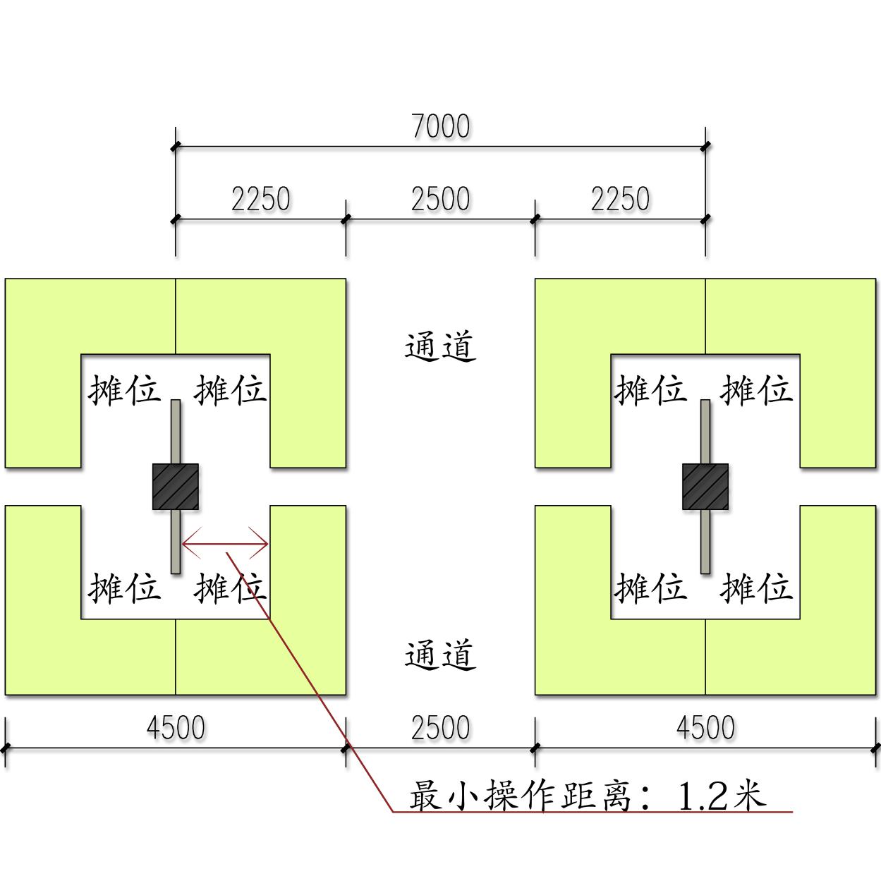 (如上图所示,以摊位最小操作距离1.2米逆向推算,两柱子的最小距离为7米)