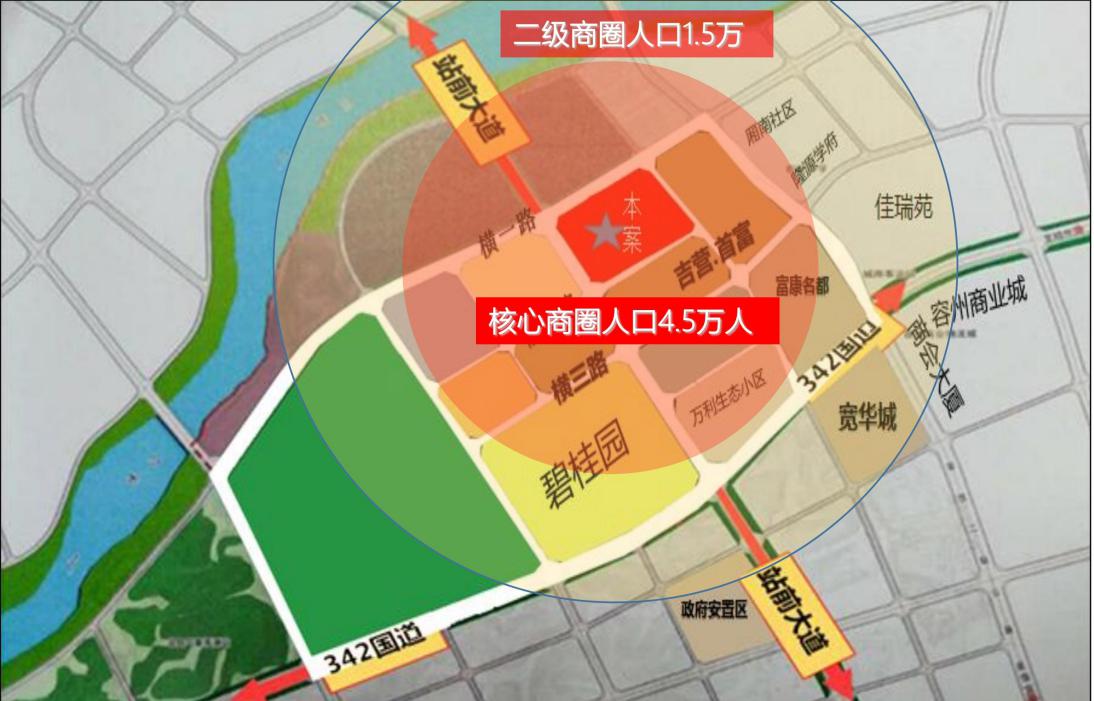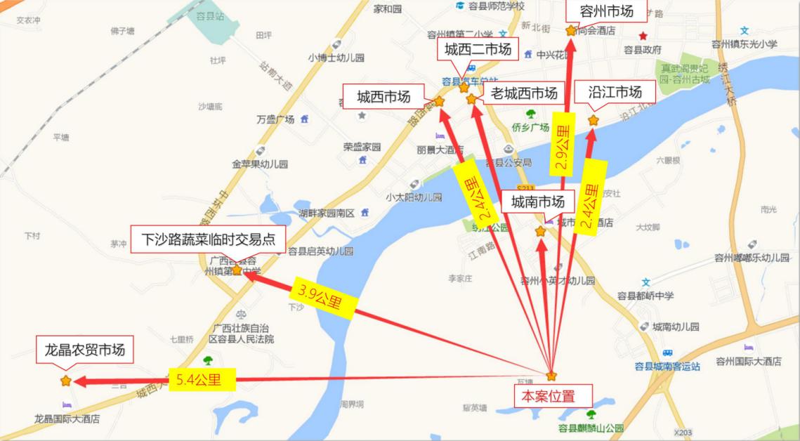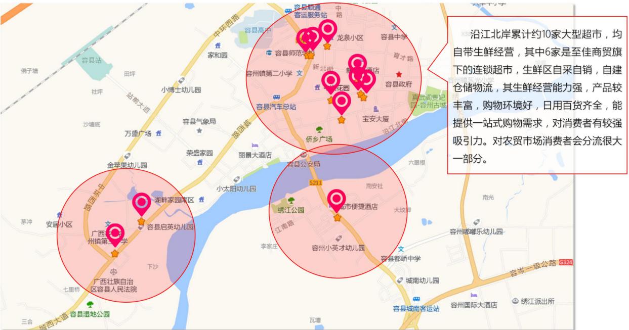 (上图为广西某农贸市场项目的选址,与绣江西北方向众多农贸市场拉开2.4公里以上的距离,成为绣江东南岸唯一的农贸市场,直接服务4.5万人口,占据优势位置。)
