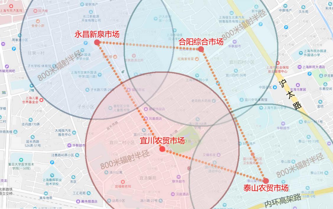 (上图是上海某农贸市场的选址调研分析报告,从周边同类竞争市场的多角度进行选址。)