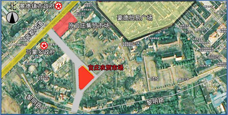 (上图为景德镇市官庄农贸市场拆建工程的项目位置分布图,可以看到新建的官庄农贸市场选址在即将拆除的老市场附近,在主路更深处虽然交通触达距离稍微变远,但更有利于规划足够的配套停车位,符合现代化农贸市场的停车需求。并且位于豪德贸易商圈周边距离不到500米,将为豪德商圈的买卖人群提供农产品供应。)