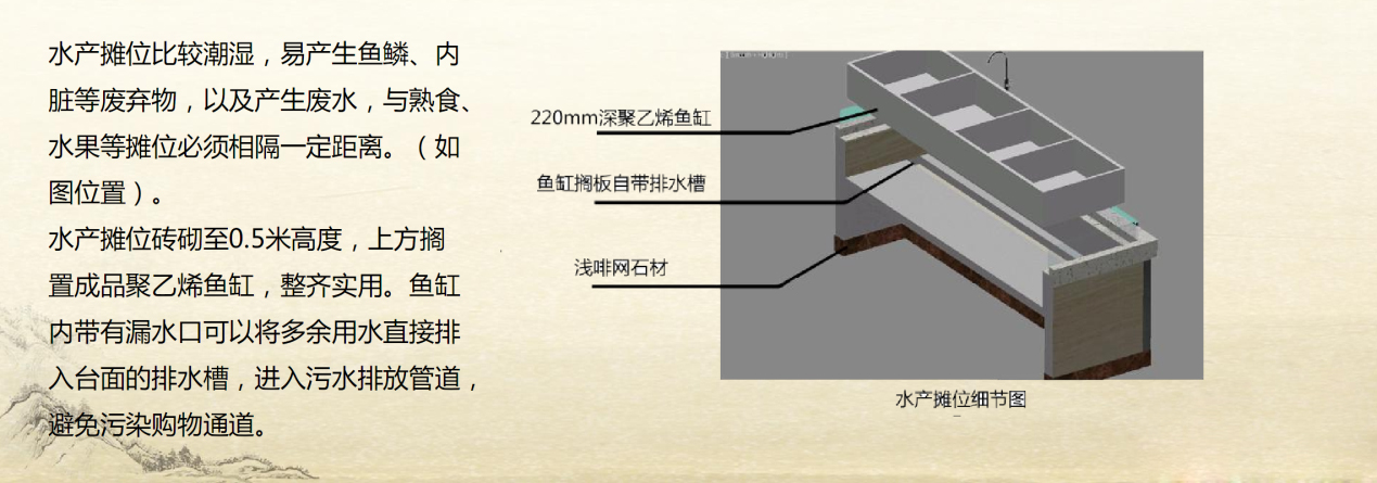 水产摊位比较潮湿,容易产生鱼鳞、内脏等废弃物,以及产生大量脏水,与熟食、水果等摊位必须隔离一段距离。另外来说,水产摊位砖必须砌到0.5米高度,上方搁置成品聚乙烯鱼缸,整齐实用,鱼缸内带有漏水口可以将多余用水直接排入台面的排水槽,进入污水排放管道,避免污染人流主干道和购物环境。